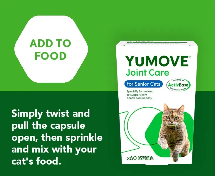 YuMOVE Senior Cats High-quality joint supplement for cats aged 8 weeks and over in need for joint aid and active support. Backed by 15 years of scientific research and trusted by pet parents worldwide, YuMOVE's triple-action formula is the UK’s #1 vet-recommended joint supplement brand for cats.